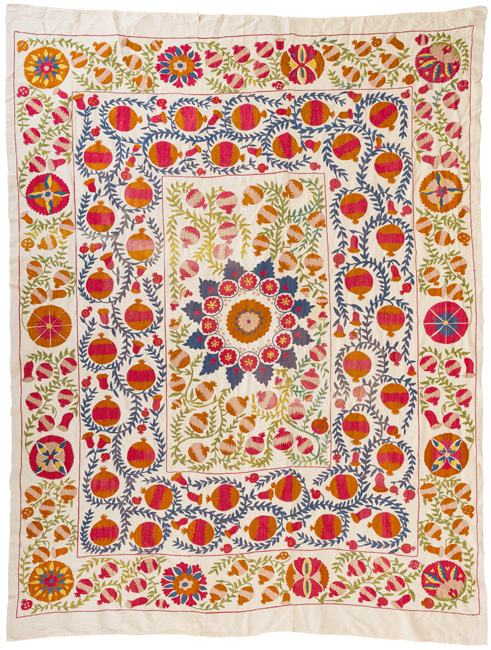 בסוזני ניתן להתרשם מעיטורים של פרחים, רימונים ועלים.